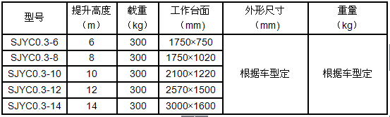 產(chǎn)品規(guī)格:車載式液壓升降平臺根據(jù)升降高度可分為:6、8、10、12、14米升降平臺,設(shè)備載重300公斤至500公斤??蛻艨筛鶕?jù)需求選用解放、東風、輕騎、福田、電瓶車等任何車型,設(shè)備直接采用汽車或電瓶的直接動力升降。